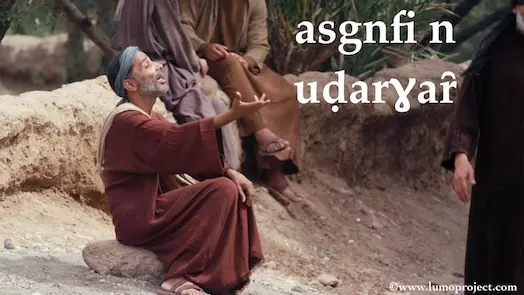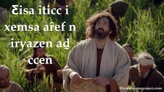 Inna-asen Ƹisa: "Ƹeqbem ƹawḏem-as i Yaḥya min ṯeẓrim ḏ min ṯesȓim: iḍarɣaȓen twaȓan, izeḥḥafen gguren, yinni ḏi iǧa jḏam genfan, iḏehcuren tesȓan, yinni immuṯen tnekkaren-d, twabeccaren ȓmusakin."